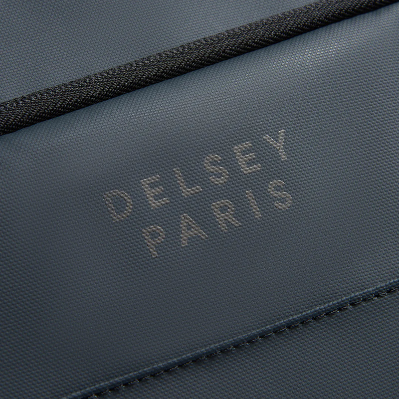 The Parvis Plus Board Case weighs 2.60 kg and measures 38 x 44 x 20 cm, including wheels and handles, with a 30 L capacity. Made from recycled polyester, it features an interior compartment designed to protect both a computer and a tablet. On the exterior, there is a small front pocket and a zipped main opening. The case is equipped with a versatile trolley system featuring two wheels for easy maneuverability.